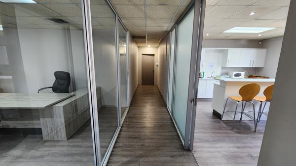 The office features a spacious open-plan layout complemented by glass-partitioned private offices, allowing for both collaborative and private working spaces. Exclusive use of restrooms and a kitchen provides added convenience, and secure parking is available at an additional cost. This well-appointed office space combines functionality with a prime location, offering an excellent opportunity for businesses looking to establish themselves in Paarls thriving commercial hub.