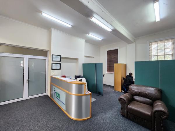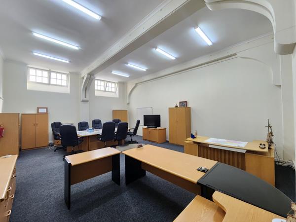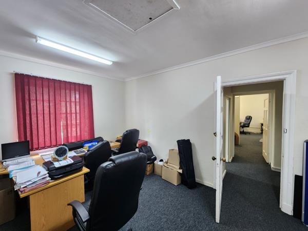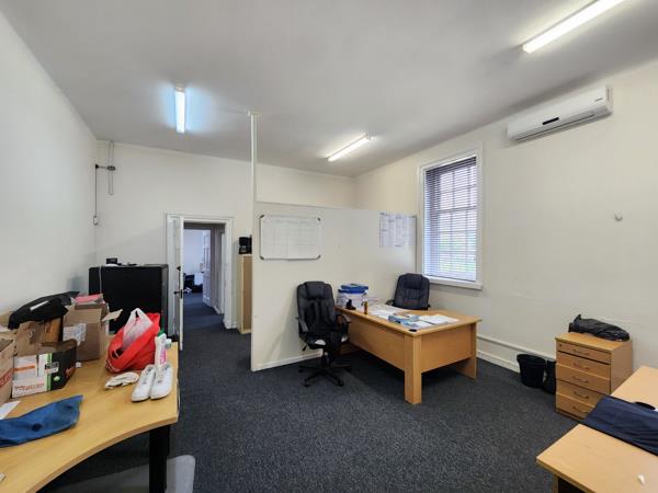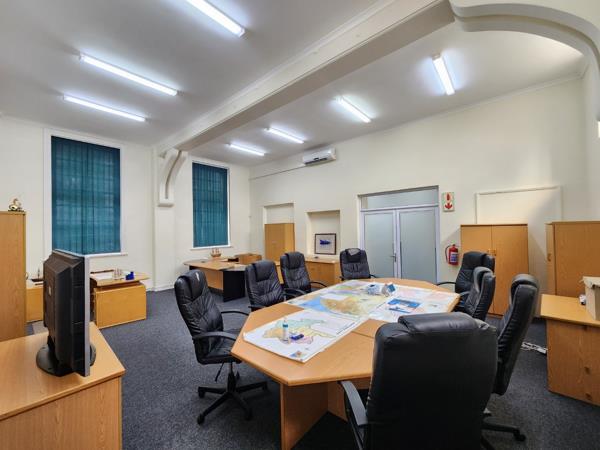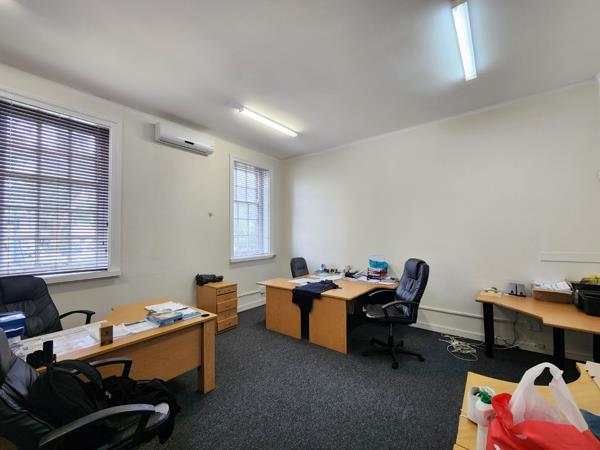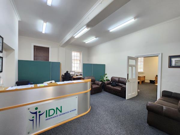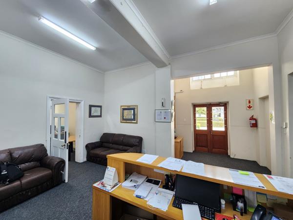 This well-designed office to let in Somerset West offers a bright and welcoming workspace, with large windows providing ample natural light throughout. It includes air conditioning, quality carpeting, and a versatile layout featuring a large boardroom or training room, a generous reception and waiting area, an open-plan section, plus private individual offices. The available office space also comes with its own kitchenette and ablution facilities for added convenience.