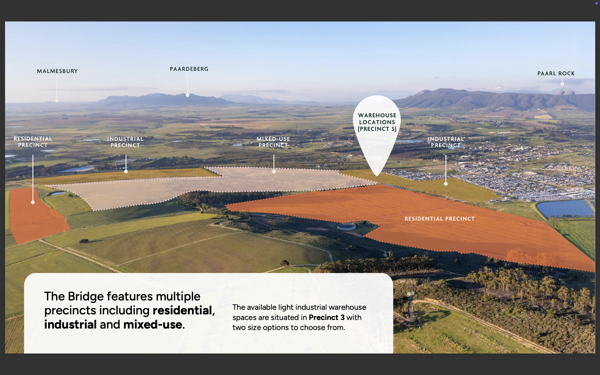 - Strategic Location: Situated in the dynamic industrial hub of Stellenbosch, Klapmuts, The Bridge enjoys a strategic location with convenient access to major transport routes. This prime positioning ensures excellent connectivity and accessibility for businesses operating within the development.