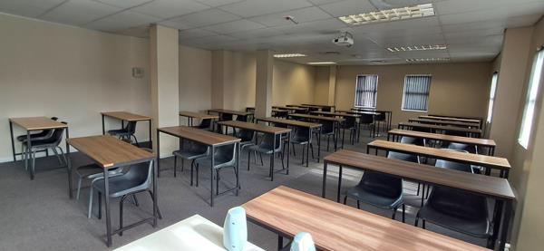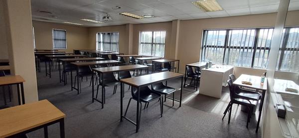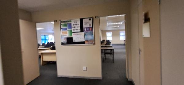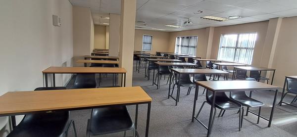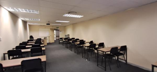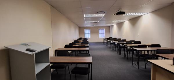 This well-lit, rectangular training or conference office offers a professional environment ideal for corporate use. Large windows along one side provide ample natural light, complemented by vertical blinds for light control. The space is equipped with ceiling-mounted lighting and built-in air conditioning, ensuring comfort throughout the day. Positioned at the front of the room are dual whiteboards and a projector screenperfectly suited for presentations, meetings, or educational sessions. A rear door offers convenient access to adjacent areas, making the layout both functional and flexible for various organizational needs.