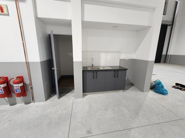 A modern, air-conditioned reception area provides a professional entrance for clients and staff. From here, a well-configured mezzanine office overlooks the warehouse floor, creating an ideal space for administrative teams, operations managers, or technical staff. Additional amenities include a contemporary kitchenette and separate ablutions for both warehouse and office personnel. The property includes five secure on-site parking bays for staff and visitors.