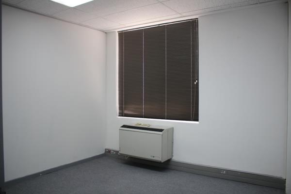 The interior boasts an adaptable layout with clean white walls and modern grey or dark carpeted flooring, complemented by practical tiled sections in some areas. Ample natural light streams through large windows, creating a bright atmosphere. Integrated drop ceilings with efficient lighting and wall-mounted air conditioning units ensure year-round comfort. The flexible design accommodates various configurations, from open-plan workstations to segmented private offices, some featuring partial glass walls for enhanced light flow.