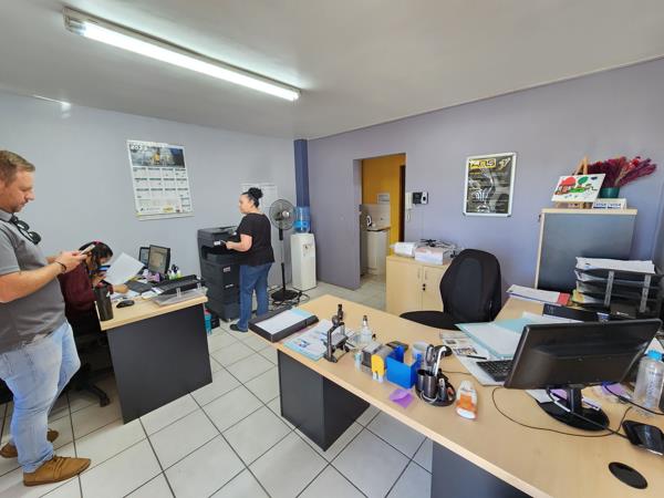 The warehouse is designed to combine practicality with comfort. The ground floor includes a neat reception area, kitchenette, and ablutions for office staff, complemented by separate facilities for warehouse staff. A standard office and additional large offices upstairs provide ample administrative space, enhanced by natural light throughout. Operational efficiency is supported by a roller shutter door for easy loading and offloading, good height to eaves for storage or racking solutions, and a reliable 3-phase 80-amp power supply suitable for a wide variety of industrial operations.
