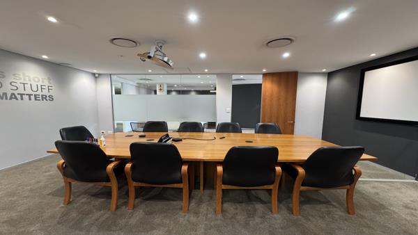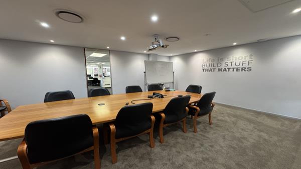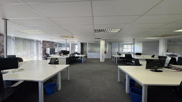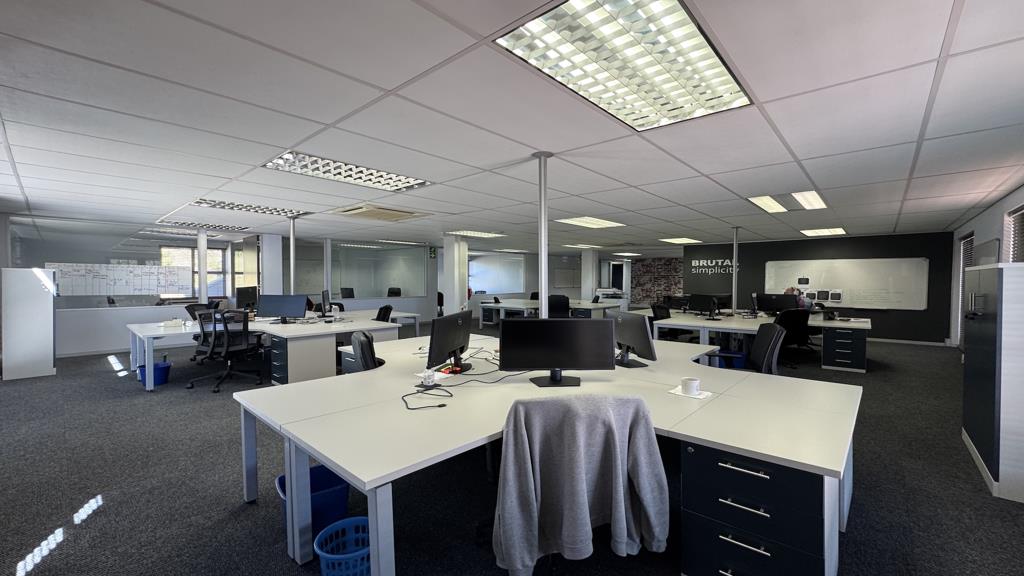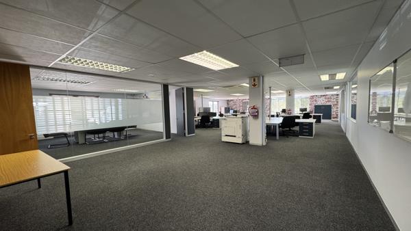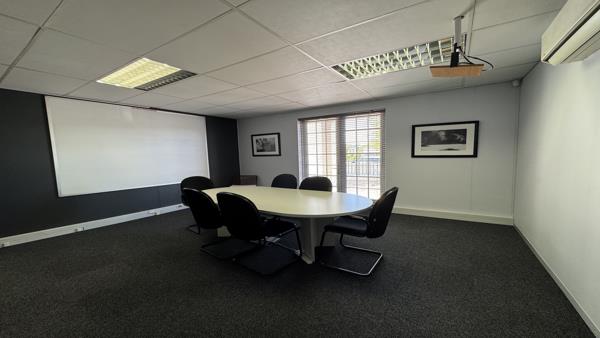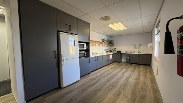 This 481m2 airconditioned office space is available on the ground floor in Regent House. The unit consists of a reception area two boardrooms, two large open spaces, with seven closed offices in various sizes and a small meeting room. The unit has a large kitchenette with a chill area for staff to relax. Both open spaces have doors leading onto the outside patio. Plenty of windows allow for natural light to flow in. The windows have blinds, and the floors are carpeted.