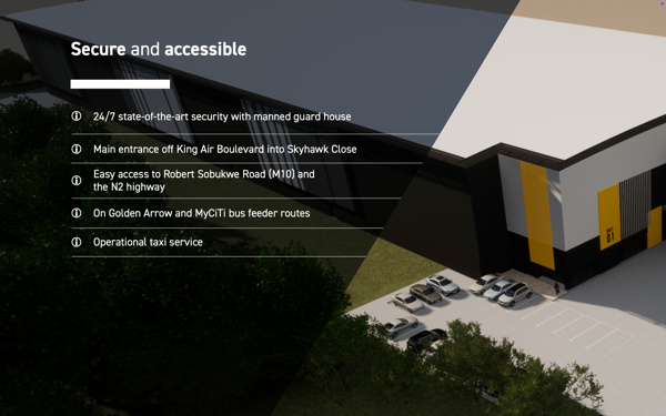 - The warehouse caters to a variety of industrial activities, including warehousing, distribution, manufacturing, assembly, or logistics operations, aligning with zoning regulations and permitted land use within Airport Industria.