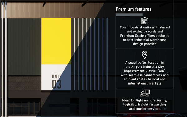 - The warehouse caters to a variety of industrial activities, including warehousing, distribution, manufacturing, assembly, or logistics operations, aligning with zoning regulations and permitted land use within Airport Industria.
