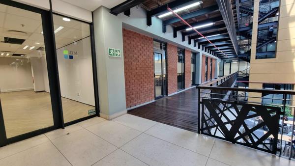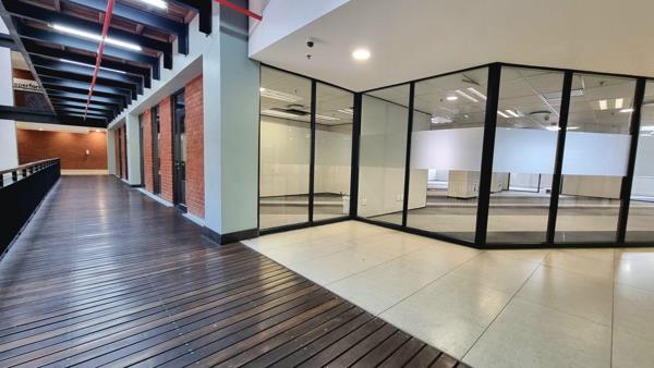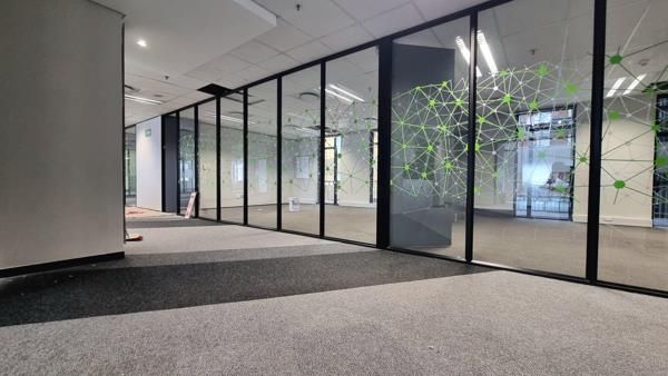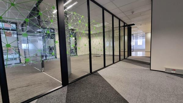 The space features open-plan areas, private offices, and boardrooms, with a welcoming reception area, kitchenette, and ablution facilities. Expansive windows provide abundant natural light and panoramic city views, creating an inspiring environment for productivity and collaboration.