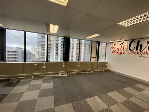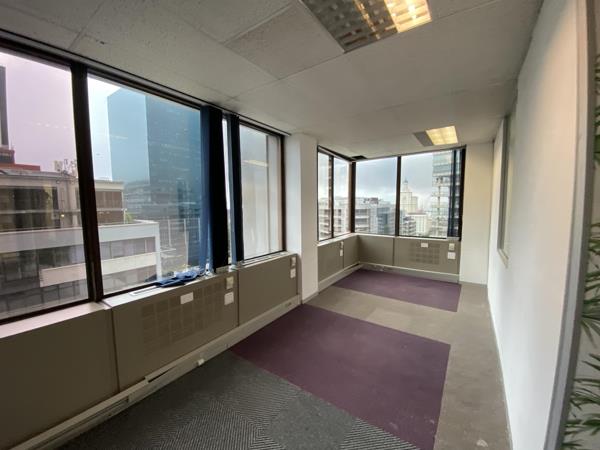 The unit is fitted with blinds, a mix of carpet and laminate flooring, and features centralized air conditioning throughout. Communal serviced ablution facilities and a convenient self-service kitchenette are available on the same floor.
