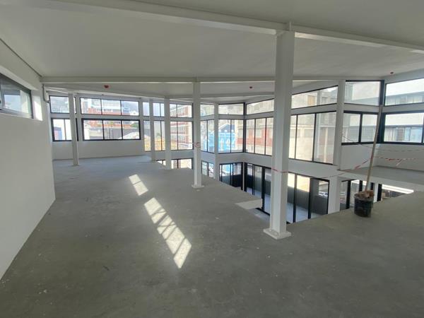 The space is a large open double-volume area that has been grey-boxed and is ready for a fit-out by new tenants.