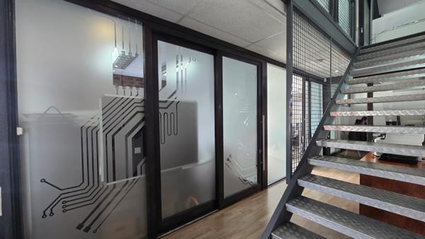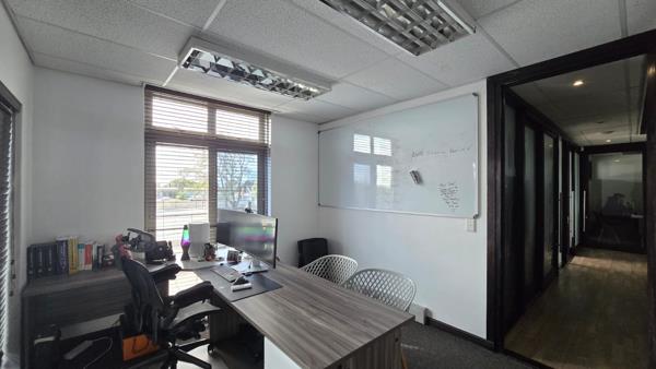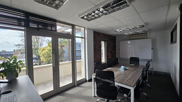 This stunning 215m2 airconditioned, two level office space is available on the first floor with a 24m2 balcony. Current layout on the first floor consists of a well sized reception area, 4 closed offices in various sizes, the biggest office is walking out onto the balcony, a boardroom with a door leading out onto the balcony, a storeroom, a kitchen and a bathroom with a shower.