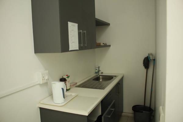 This versatile commercial unit is well-suited for retail operations, a professional office requiring a storefront presence, or a showroom. Its adaptable design allows for easy customisation to meet specific business needs. A compact, functional kitchenette area with modern grey cabinetry, a sink, and counter space provides essential staff amenities, ensuring convenience for daily operations.
