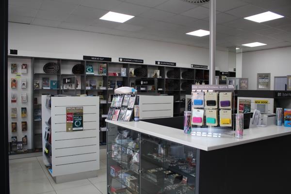 The interior boasts a bright and organized layout, characterized by excellent overhead fluorescent lighting and clean, tiled flooring throughout. Currently configured as a retail bookshop, the space includes organized shelving units, a dedicated service counter with a display case, and clear departmental signage, demonstrating its adaptability for diverse retail concepts. The modern aesthetic, with white walls and light flooring, provides a neutral canvas for any business.