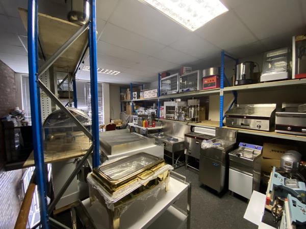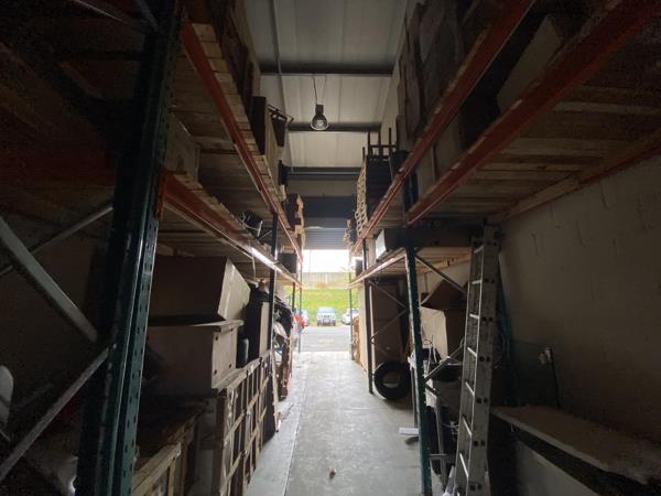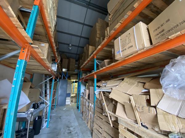 The warehouse area is open plan with high ceilings, ideal for stacking and efficient workflow. The space extends from the back and wraps around to the front where a large roller shutter door allows for easy access and loading.