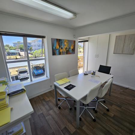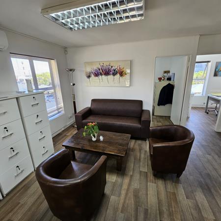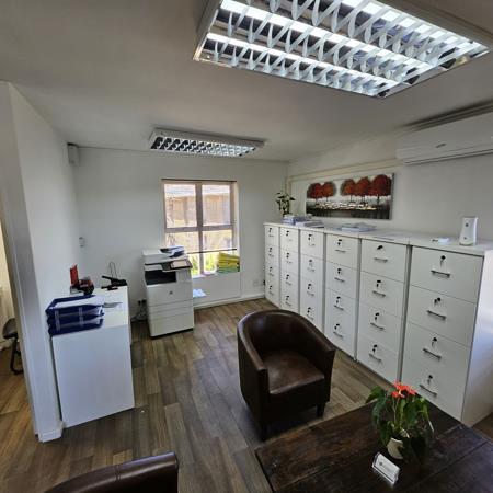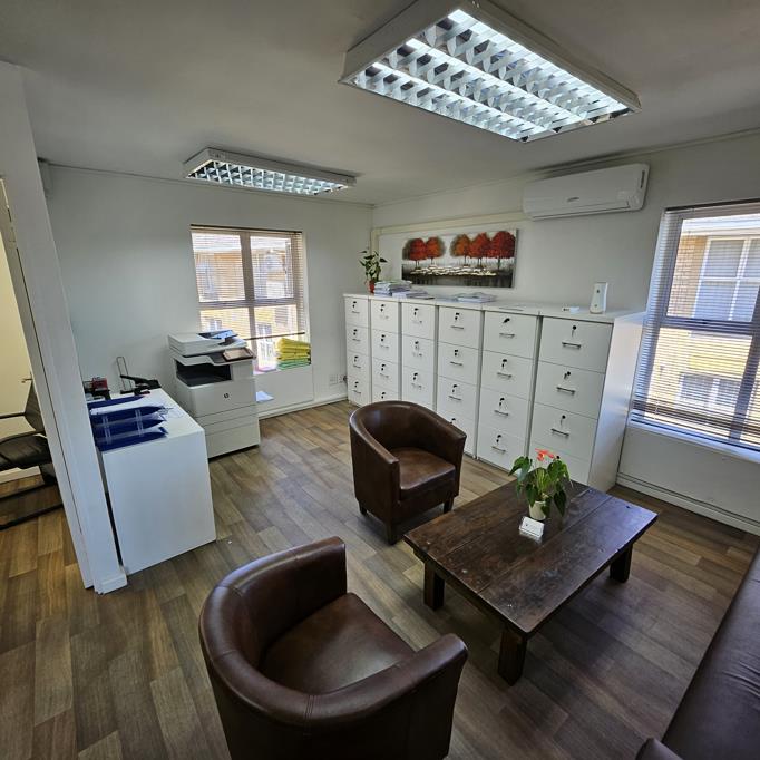 The office features modern laminated flooring and air conditioning throughout, creating a comfortable and professional working environment.