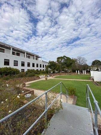 The grey box unit boasts excellent natural light and scenic views overlooking both the beautifully maintained internal courtyard and the historic tree-lined Rondebosch Main Road.