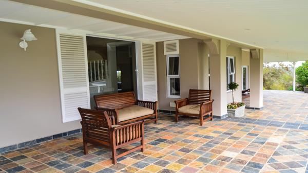 Upon entering The Manor House, one goes through the glass-stained front door sculpted by the well-known Dave Manning. There is a magnificent staircase made out of white oak taking in the entrance hall. Downstairs you will find 3 lounges, with a fireplace encompassed by a complete wrap-around veranda. There is also a dining room that can seat 20 people with a lovely deck and uninterrupted views. A bonus is a level grassed area which can house a large glass tent or stretch tent, and close by, its own ladies and gents private bathroom facilities located under the deck area.