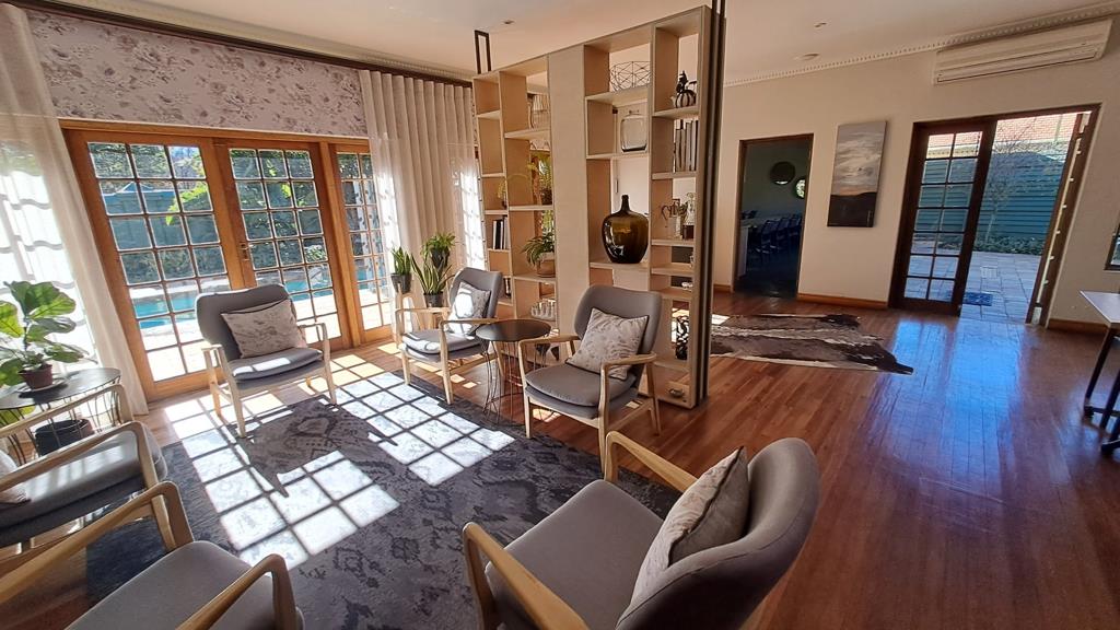 Towards the living room, you will find a passage leading to the first guest room currently utilized for staff and an additional five north-facing bedrooms. All rooms are thoughtfully furnished with comfort and space in mind. Each room opens onto a balcony overlooking a beautifully maintained water-wise garden, providing a tranquil space for guests to relax or enjoy a smoke break. For those who prefer a self-catering option, there is also a braai area in the garden.