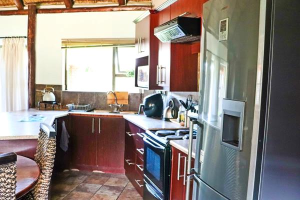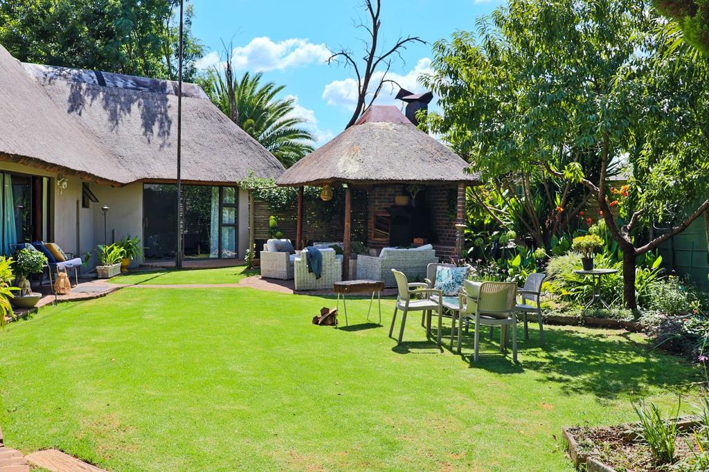 The large under-roof patio overlooking a sparkling blue swimming pool and separate entertainment areas with braai facilities enhance the guest experience and create opportunities for hosting events or gatherings.