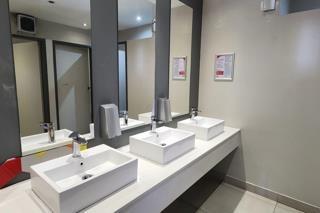 The interior layout is highly adaptable, with a large floor area that can be configured to suit diverse business needs. The property includes well-appointed kitchens, catering to the demands of a large workforce or multiple tenants. A long, carpeted office hallway provides access to numerous private offices. Modern and clean public restrooms, equipped with multiple sinks, ensure comfort and convenience for all occupants.