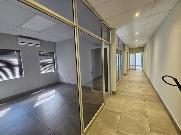 This unit boasts a remarkable double-storey office space (351 sqm) that includes a variety of closed and open-plan offices, two boardrooms, a welcoming reception area, an executive kitchenette for staff, air conditioning, underfloor heating, and solar power for the office section. It also features a walk-in safe room and ample parking for employees.