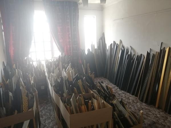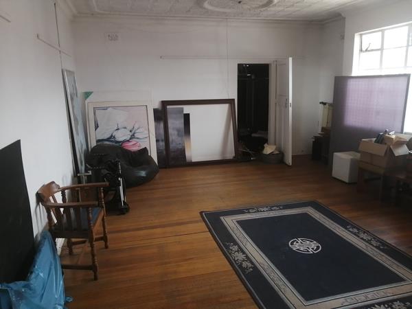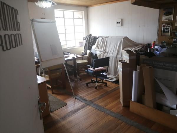 The interior features spacious rooms with high ceilings and original wooden floorboards, providing a solid foundation for renovation. While some areas present a cluttered appearance and require modernization, the potential for transformation is evident. Natural light floods through large windows, enhancing the appeal of the various spaces, which could serve as offices, workshops, or additional retail areas.