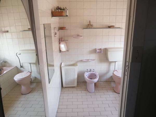 Upstairs, the property includes a functional, albeit dated, kitchen with ample cabinetry and a dedicated dining area. A bathroom with tiled walls and floor, featuring a toilet and bidet, adds to the property''s utility. The presence of security bars on windows and security gates on the exterior provides a foundational level of protection.