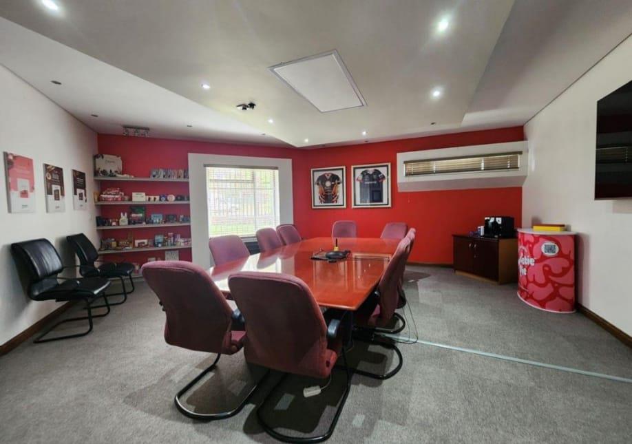 900 sqm triple volume office space including reception area, individual and open-plan offices, boardrooms, kitchen, ample parking for staff and visitors, plus a security guard house for access control.