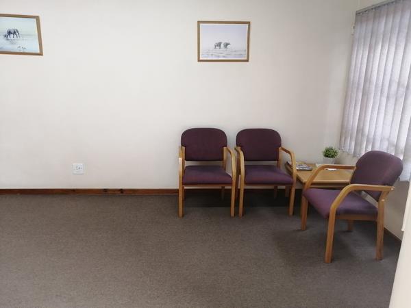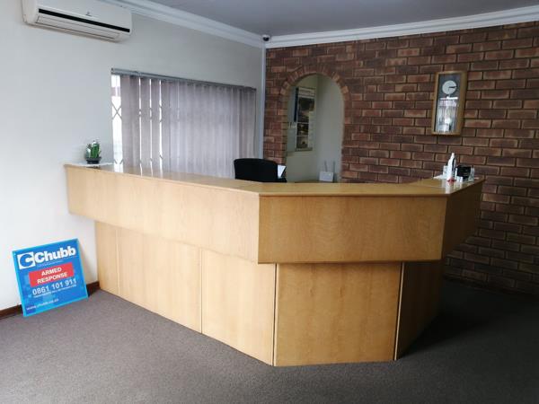 - Reception area with front desk plus small space behind office desk for filing