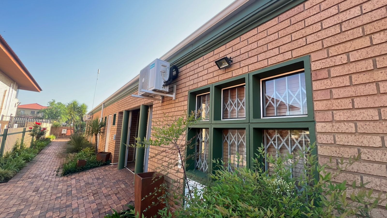 Comprehensive security system including alarm, beams, burglar bars, and exterior lighting (day/night switch)