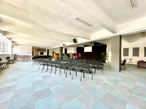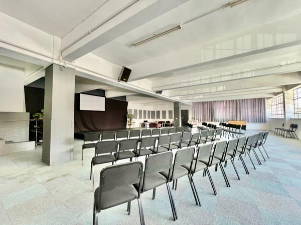 The interior features a large, open-plan layout with high ceilings and abundant natural light from numerous windows, ideal for a variety of commercial uses. Currently configured as a multi-functional hall, it includes a dedicated stage with a projector screen and sound system, alongside flexible seating arrangements and distinct zones suitable for presentations, events, or office setups. The property also includes one kitchen and three bathrooms, providing essential amenities. While the aesthetic is utilitarian with exposed elements and some wear, it offers a blank canvas for customisation and modernisation to suit specific business needs.