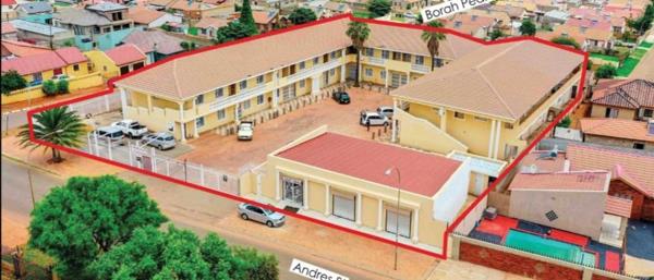 Discover a significant commercial investment opportunity in Lenasia South, Johannesburg. This expansive multi-unit property features a robust U-shaped design, comprising two-story buildings with a light yellow exterior and classic terracotta-style tiled roofs. The complex is thoughtfully laid out around a large, central paved courtyard, providing ample off-street parking for residents and commercial patrons alike. With a dedicated commercialretail space fronting the street, complete with roll-down shutters, this property offers diverse income streams and excellent visibility.