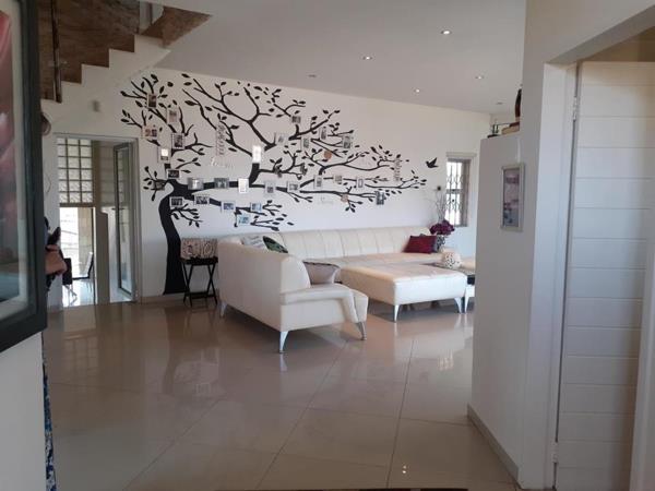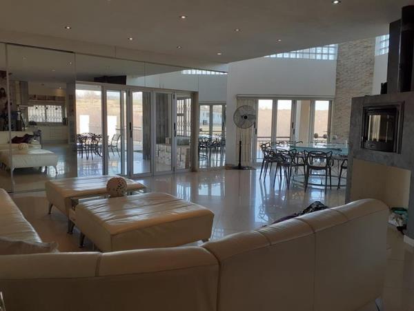 The house is over 700m2, over 3 stories, of carefully designed space with views across the Jukskei River and Northern Farms. On the ground floor are a massive open plan lounge and dining room with fireplace, both leading onto the patio, with heated rim flow pool, a kitchen and scullery and 4 garages. There is also a large playroom with bedroom and bath which can function as a separate apartment.