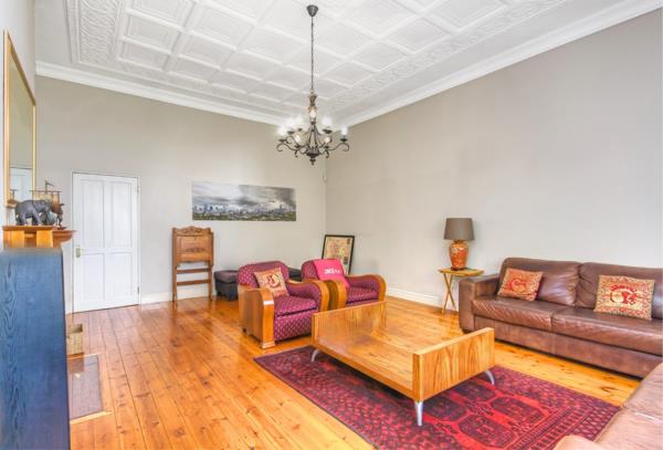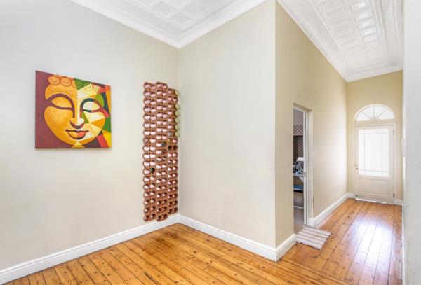 The house retains period character through great proportions, high pressed steel ceilings, wood floors, and bay windows, complemented by tasteful feature light fittings. A wood-burning fireplace anchors the lounge, while two inter-leading reception rooms offer flexibility for entertaining or day-to-day living.
