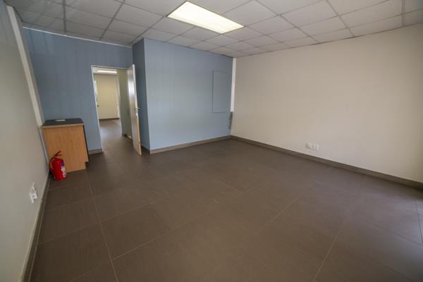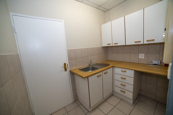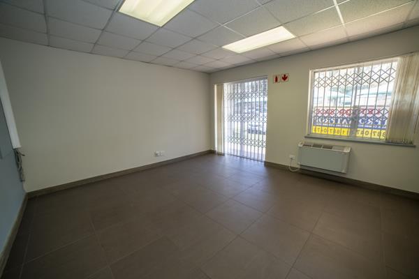 The modern office has been updated with new tiling, fresh paint, and a practical layout. It includes a small kitchen, a toilet with basin, and two air conditioning units (ceiling- and wall-mounted) for year-round comfort. Fibre and Telkom connections are available in the building, ensuring seamless connectivity.