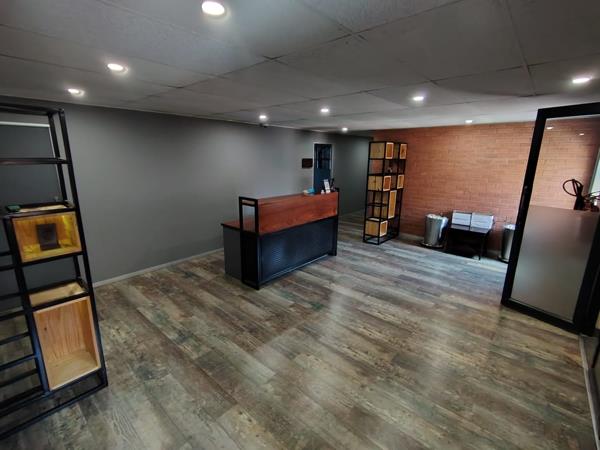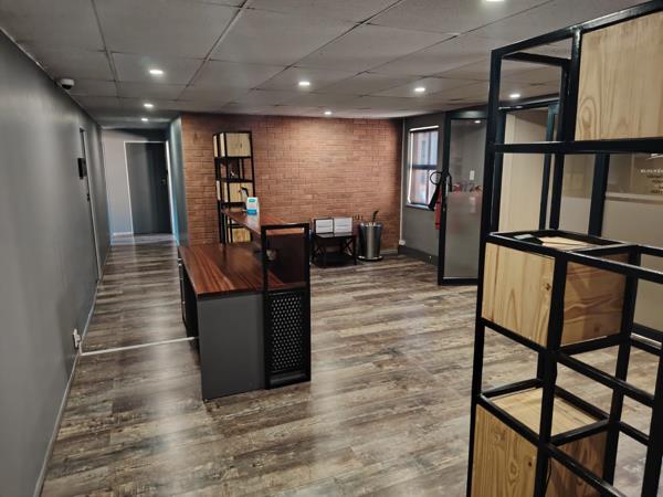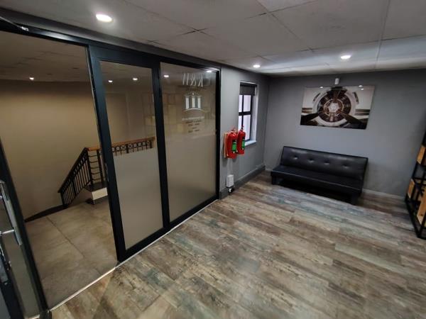 The office layout has been thoughtfully designed, featuring a welcoming reception area, three private offices, a modern kitchen, and ablution facilities. Air-conditioning throughout ensures a comfortable working environment, while large windows with blinds allow for an abundance of natural light. The space is finished with carpeted flooring, adding to the professional atmosphere.