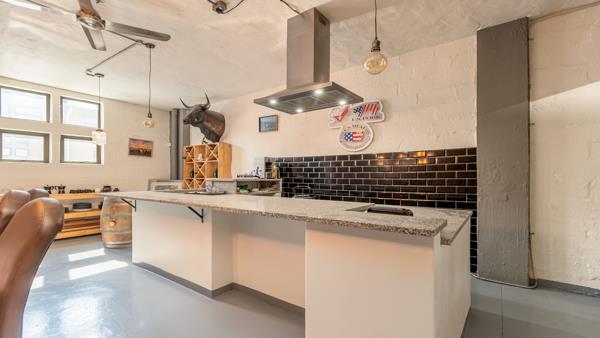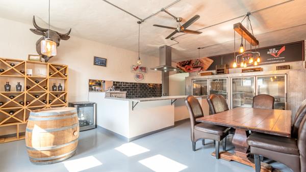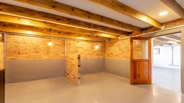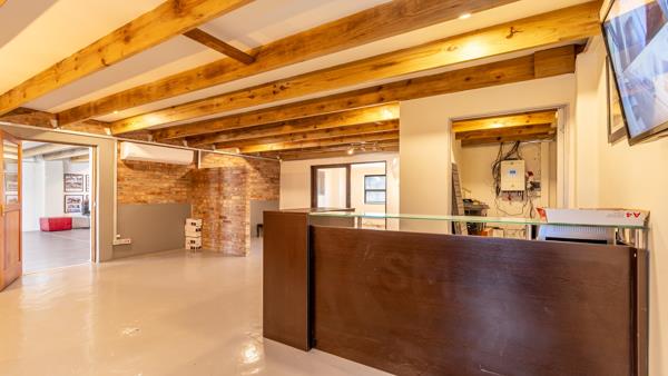 The upper level boasts contemporary office space featuring two open-plan work areas, a private office, a storeroom, and ablution facilities. Additional benefits include air conditioning, back-up power, water storage, and stylish furnishings, ensuring comfort and functionality.