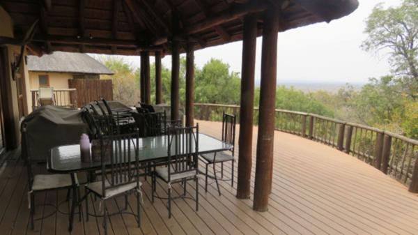 Outdoor living: Undercover patio with expansive wooden deck overlooking the valley and game areas