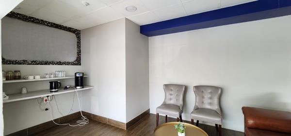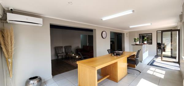 Further enhancing its appeal, the premises feature a dedicated coffeebreak station, a functional kitchen, and well-maintained restrooms. The interior spaces offer a mix of modern wood-look tile flooring and practical tiled surfaces, ensuring durability and ease of maintenance. Security is a priority, with visible cameras installed throughout the property, providing peace of mind. This commercial building is perfectly suited for businesses seeking a high-visibility location with adaptable spaces for both client-facing operations and administrative functions.
