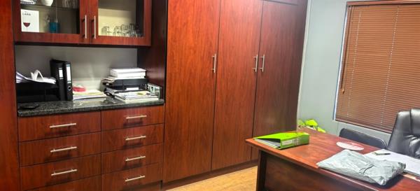 The interior includes a reception area with a fitted reception counter, a boardroom, and three office spaces, all equipped with built-in cupboards, plus a dedicated filing room. A fully fitted kitchen and separate ladies and mens toilets provide convenience for staff and visitors.