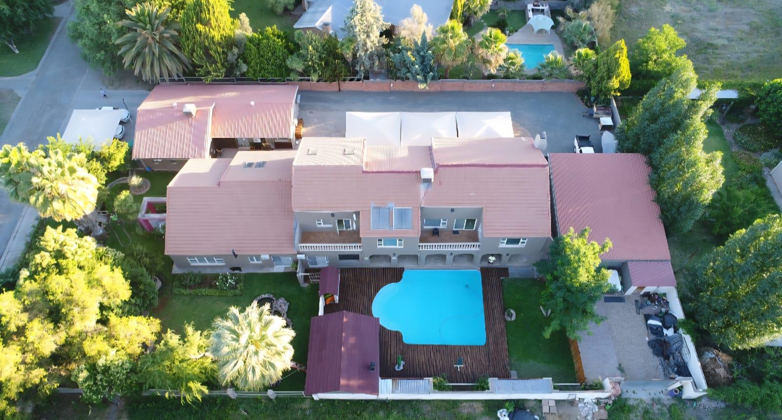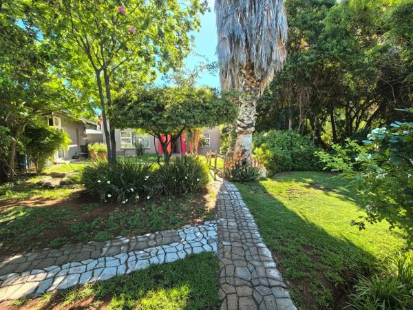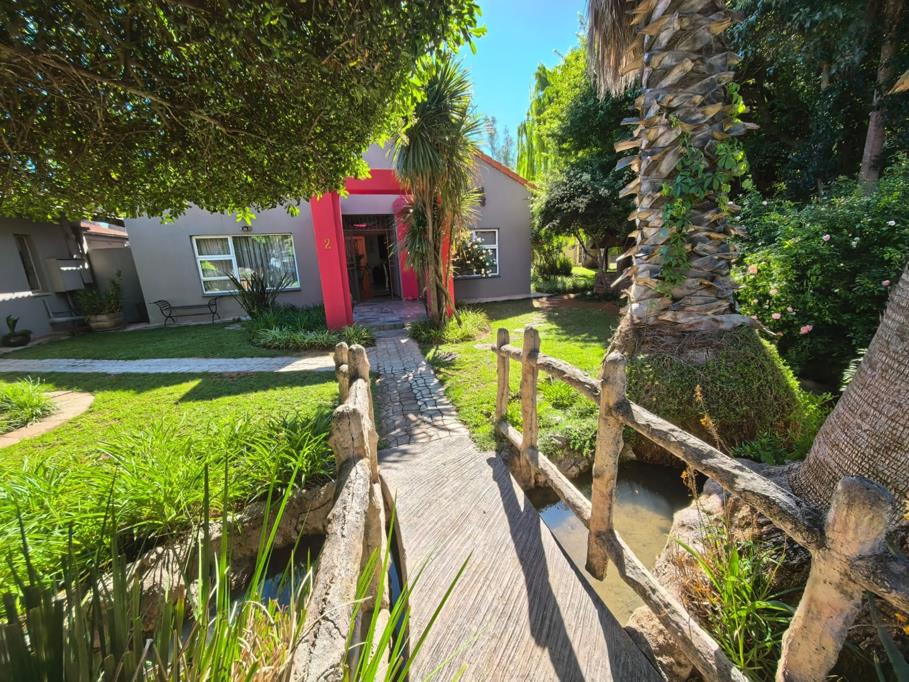 This fully furnished 13-bedroom, 11-bathroom guesthouse rests on a lush, landscaped erf surrounded by colourful rose gardens and mature trees. Renovated in 2016, the property was designed for both comfort and efficiency, featuring solar power, a 40 kVA generator, water filtration system, 5 000 L JoJo tank with pressure pump, and an old working well that adds timeless character.