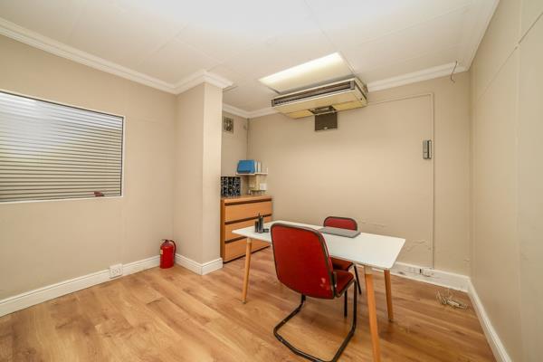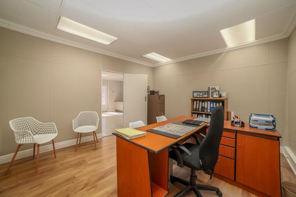 Step into a generous reception area that welcomes clients and guests, leading to four well-appointed offices and an additional room with ample cupboard space, ideal for storage or as a flexible workspace. A convenient small kitchen is also included, ensuring practicality for daily operations. The property features two secure, under-roof parking spaces, providing peace of mind for both employees and clients.