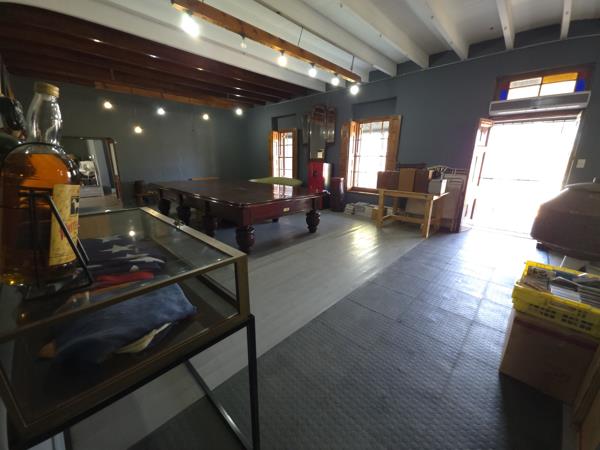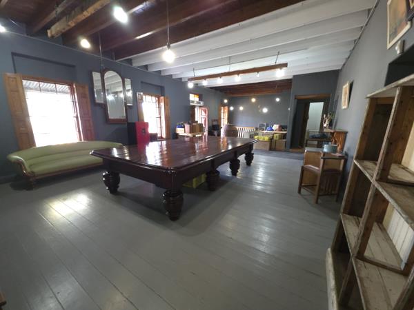 A generous entertainment or recreational area with exposed beams