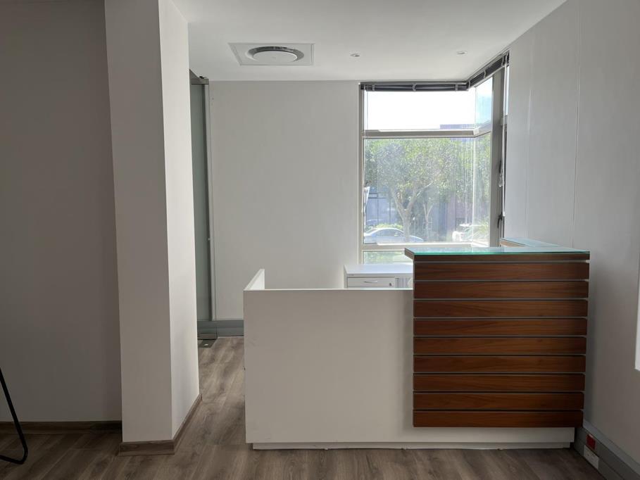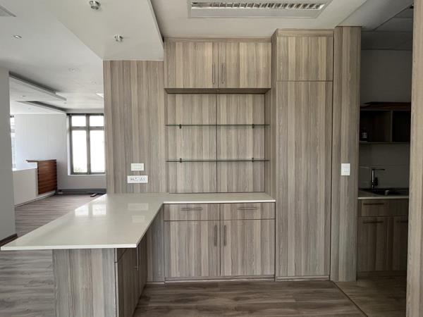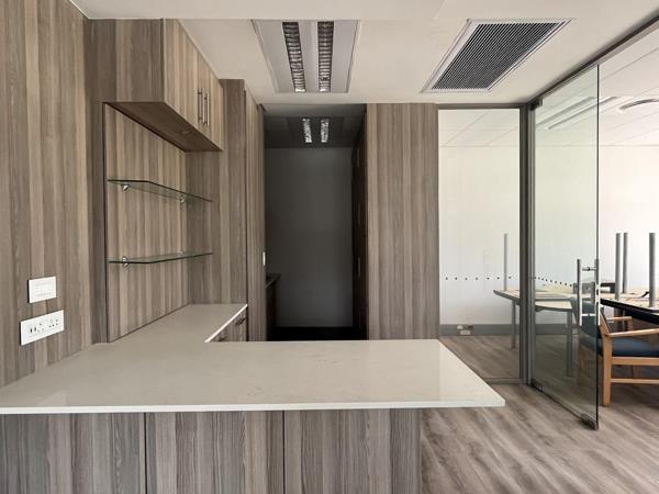 The Office has a spacious balcony, glass partitioning, a fully fitted kitchen, 8 seater board, reception, executive office and an open plan workspace.