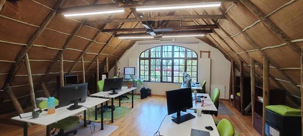 The building is tastefully designed with downstairs and upstairs offices and currently quite a large space is allocated to board rooms and a communal kitchen and cafe area.