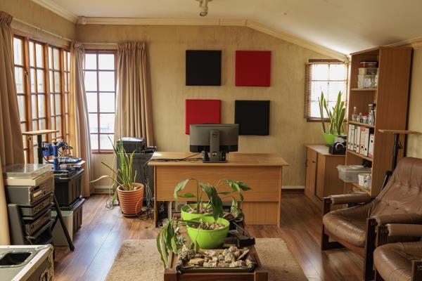 Residence: A comfortable 1-bedroom home with en-suite bathroom, kitchen, living area, covered stoep, and double garage ideal for on-site management or rental accommodation.