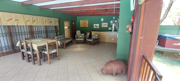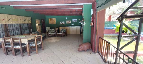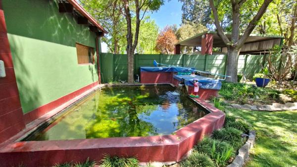 The entertainment area, complete with a built-in braai, opens to a large swimming pool and a peaceful pond perfect for gatherings with friends and family.