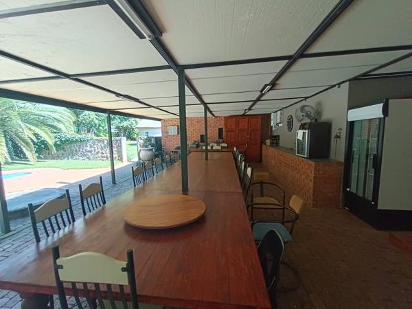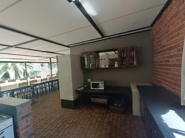 Large under-roof entertaining area close to church, there is a swimming pool, boma, large braai area, pizza oven, large kitchen with a gas stove & toilet facilities.