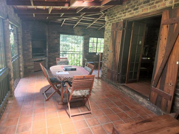The property, boast with Rhodesian Teak wood, finishes, beams, staircases, some doors, and cupboards etc. The open plan lounge has a cosy fireplace and an open plan dining area. A covered and semi enclosed patio with a built-in braai is ideal for entertaining, this leads out from the lounge with a stunning view of the well-established garden. Aside from the cosy kitchen you will find a pantry, laundry, study nook and a smaller area for a kitchen table.
