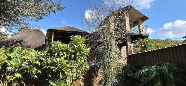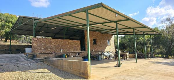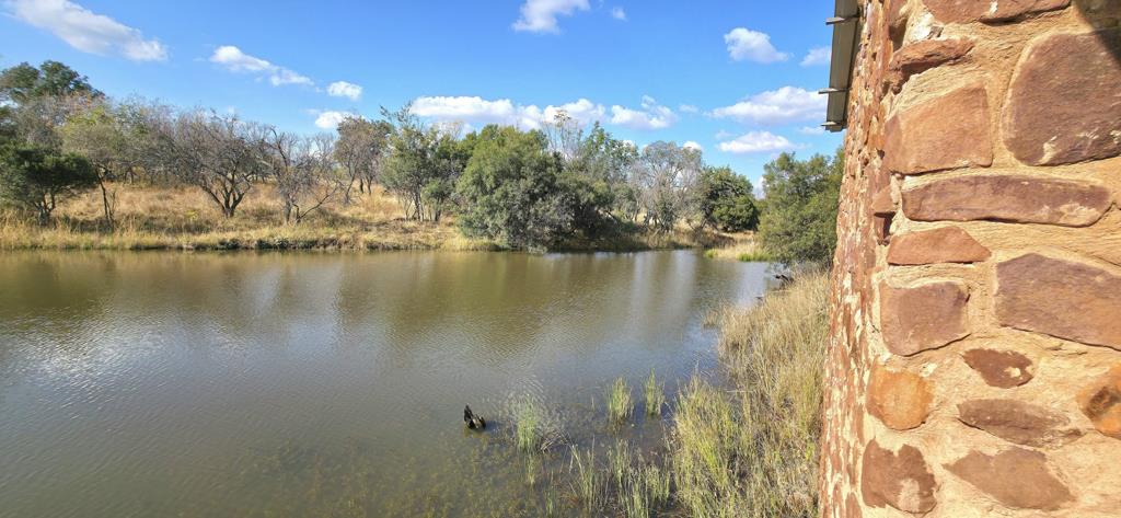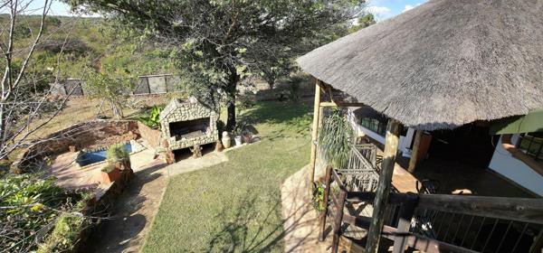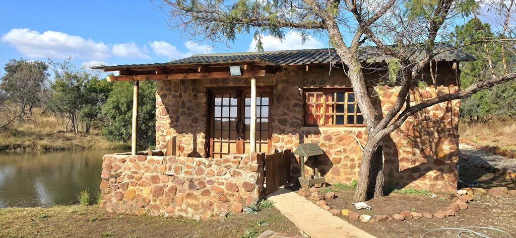 The property features a charming bush camp nestled beside a large dam, complete with a stone-built house, outdoor entertainment area, and a splash pool, perfect for relaxed getaways in nature.