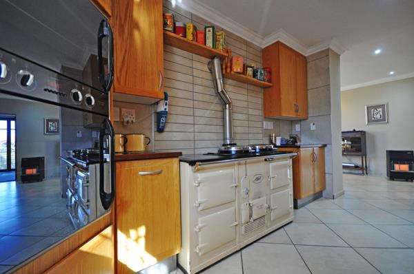 Open plan Dinning and kitchen area with a beautiful AGA coal stove, Defy double eye level stove, a 5 plate gas and 4 plate electric hob.